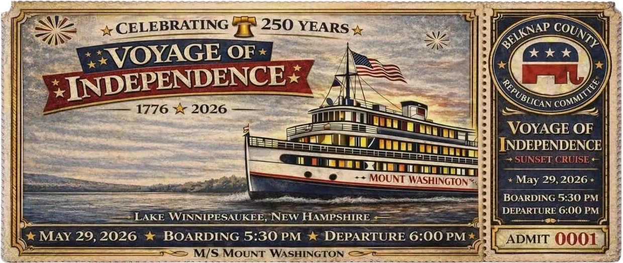 Join the Belknap County Republican Committee for the Voyage of Independence Sunset Cruise as we celebrate 250 years of American independence aboard the historic M/S Mount Washington. This annual Republican cruise brings together supporters, elected officials, candidates, and community leaders for an evening of conversation, dining, and celebration on beautiful Lake Winnipesaukee.